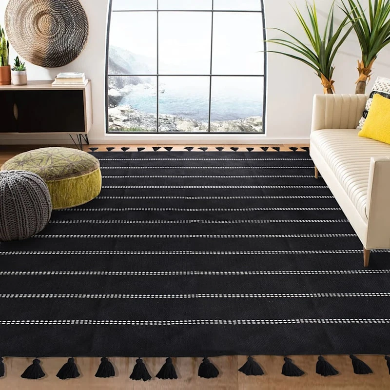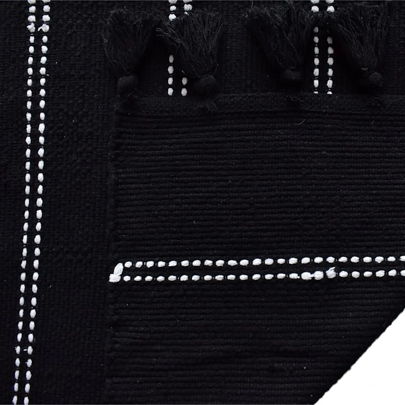 Modern farmhouse meets At Home prices in Honeybloom, our exclusive new brand that celebrates life lived together. All artistic aspects aside, area rugs help absorb and decrease the noise factor as they soften the step on any hard flooring within your home. Take our flatweave black striped woven area rug, for example. Designed with a solid natural and neutral colorway, this area rug brings an element of organic simplicity to your space. Perfectly at home in casual to formal situations, this 100% cotton rug is a natural go-to for eclectic living rooms, bedrooms and so much more. Available in 2x4ft., 5x7ft. and 8x10ft. sizes and a 2x7ft. runner.