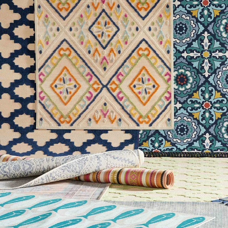 Soft and plush, the high/low pile on our multicolor outdoor diamond design area rug is 100% synthetic, which prevents shedding. The abstract colorful diamond medallion print in fun tones of blue, pink, green, yellow and tan will tie together any fashionable space. Add a sense of vibrant contemporary flair to any outdoor living area with this attractive rug. Available in 5x7ft. and 8x10ft. sizes.