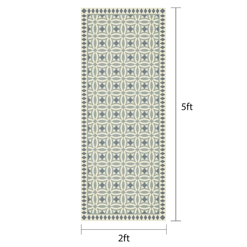 Our charming vinyl beige/blue 2x5ft. accent runner rug is ideal for updated and modern settings, and it helps with noise levels and keeps bare floors nice and comfy. The smooth vinyl and allover medallion tile design offers a nice feeling decorative touch. This wonderful area rug will be comfortable in a contemporary loft or just at home in a modern farmhouse.